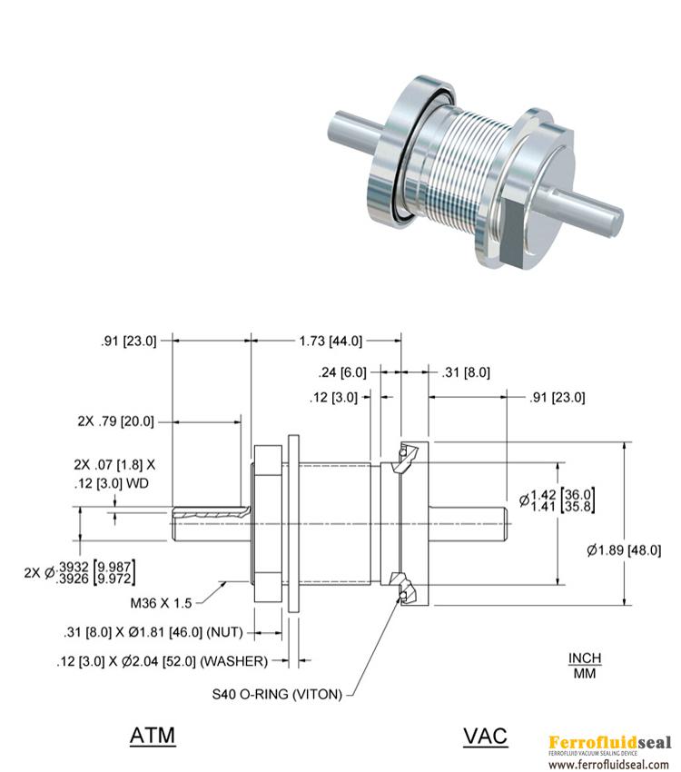 Ferrofluidic seal Feedthrough Model SNL-010-NN (part number 121503) is a member of Nut-Mount Feedthroughs. The SNL-010-NN vacuum rotary feedthrough uses standard hydrocarbon-based ferrofluid, specifically optimized for introducing rotary motion with a magnetic liquid hermetic seal in most Standard environments.