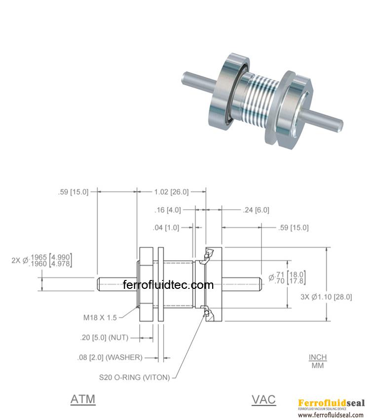 Ferrofluidic seal Feedthrough Model SNL-005-NN (part number 133598) is a Nut-Mount Feedthroughs. The SNL-005-NN vacuum rotary feedthrough uses standard hydrocarbon-based ferrofluid, specifically optimized for introducing rotary motion with a magnetic liquid hermetic seal in most Standard environments.